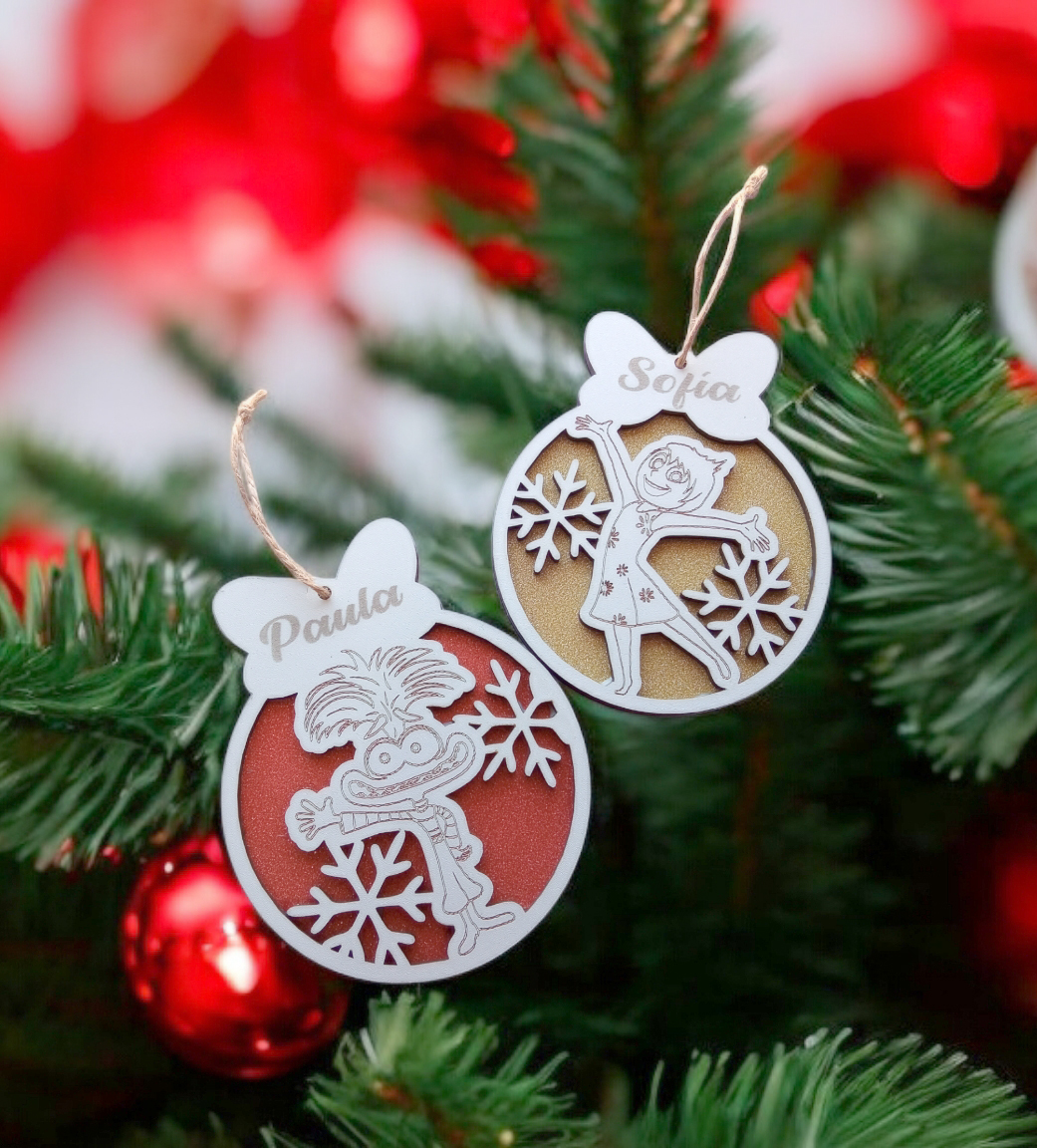 Bolas de Navidad personalizadas con nombres y diseños inspirados en la película “Del Revés”. Ideales para decorar el árbol de los fans de esta película.