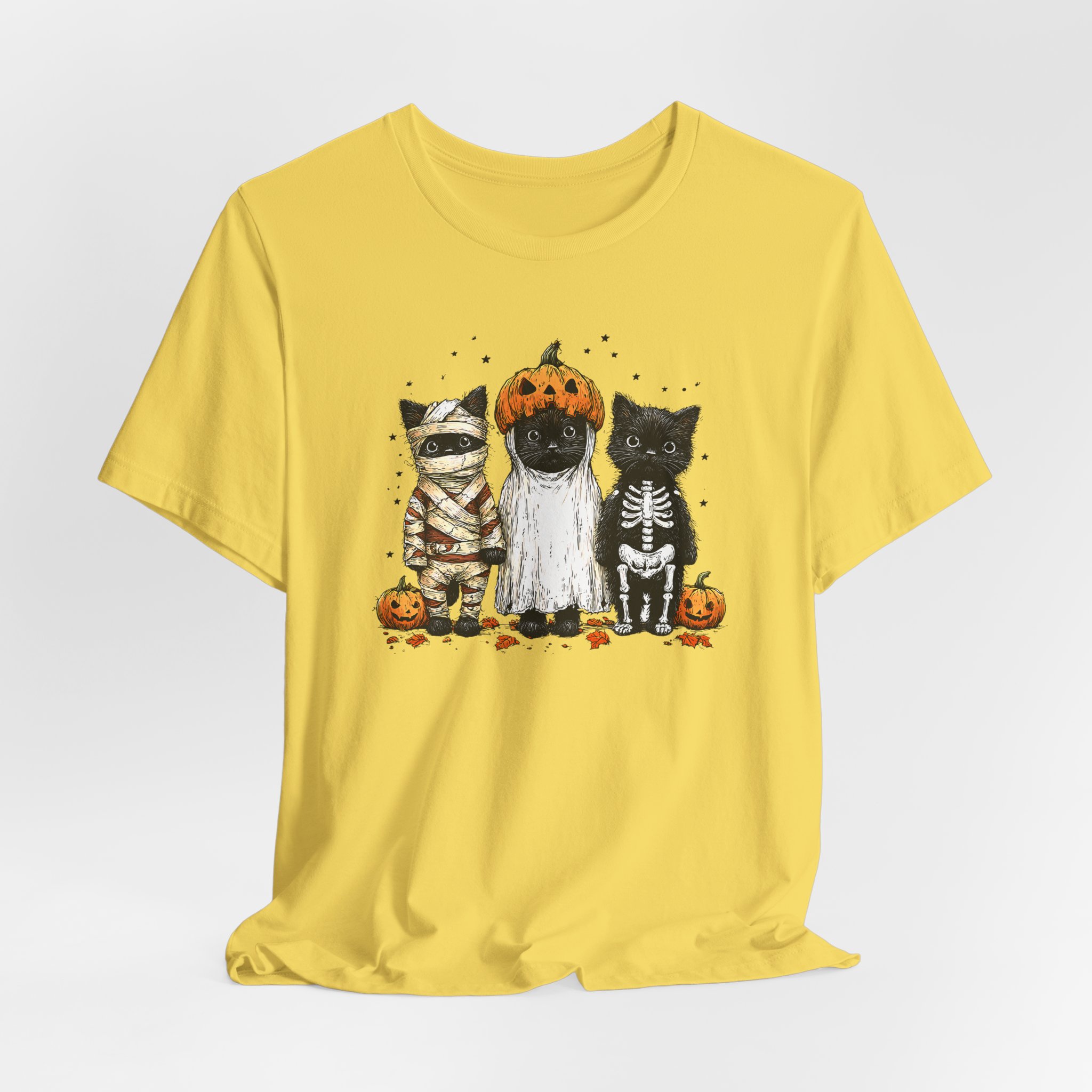 Camiseta de algodón con estampado original de tres gatos disfrazados de momia, fantasma y esqueleto para Halloween. Perfecta para fiestas temáticas, amantes de los gatos y looks divertidos. Prenda cómoda, suave y con diseño exclusivo que destaca en celebraciones de otoño y noche de brujas.