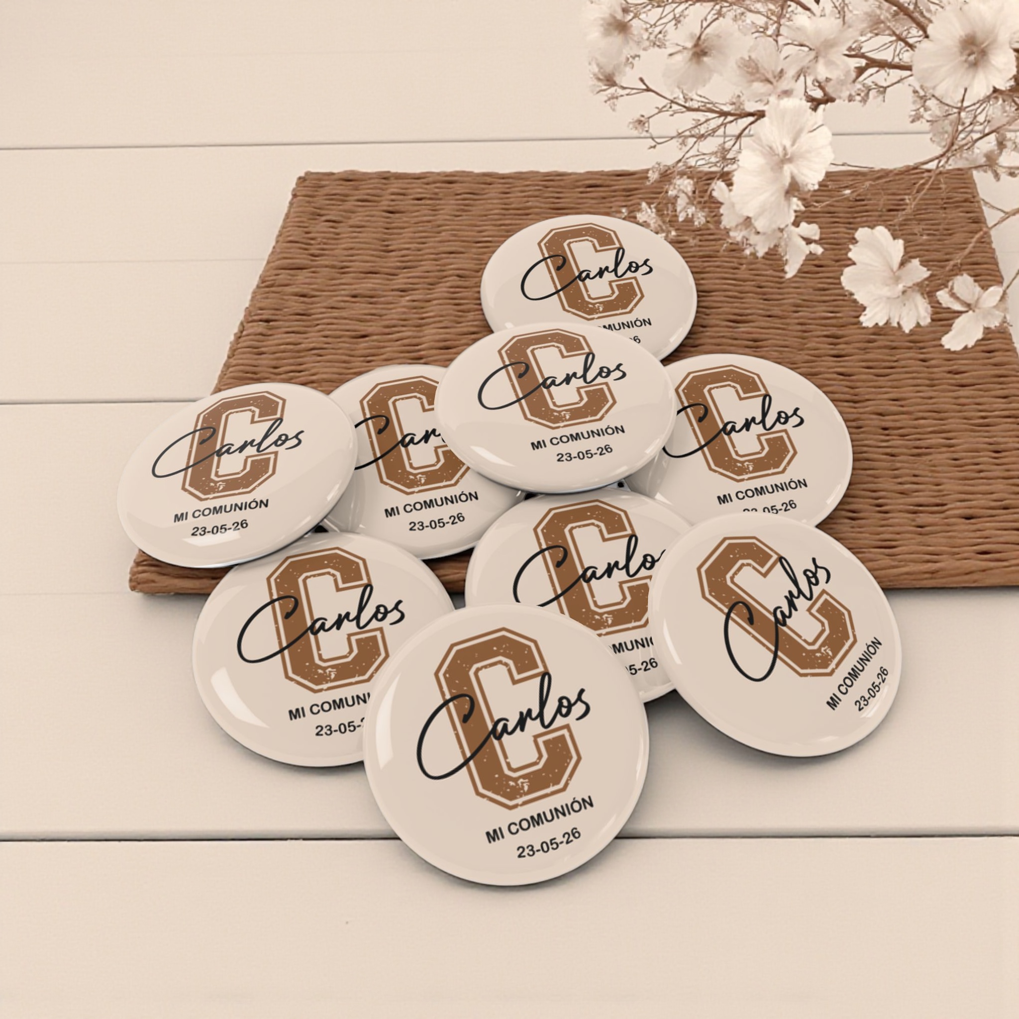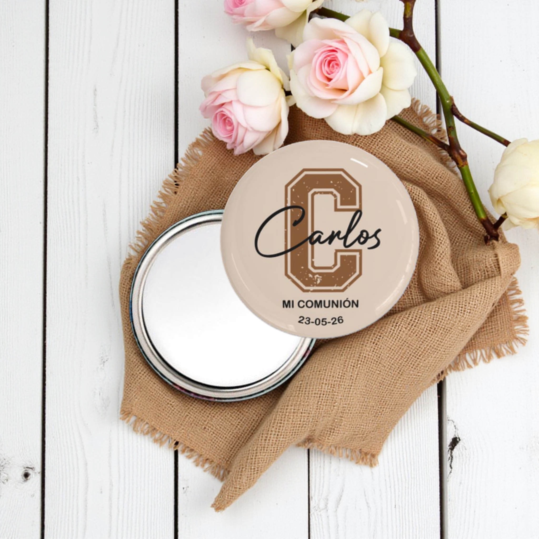 Sorprende a tus invitados con este espejo personalizado, el detalle perfecto para comuniones. Este original espejo de bolsillo, fabricado en metal resistente y con acabado brillante, incluye el nombre y la fecha de la celebración para que cada invitado tenga un recuerdo único y práctico. Su parte trasera de espejo lo convierte en el accesorio ideal para llevar siempre en el bolso, permitiendo a tus invitados recordar este día tan especial en cualquier momento. El diseño exclusivo puede adaptarse a tus preferencias: colores, iniciales y texto completamente personalizables para ajustarse a la temática de tu evento. Presentación cuidada en bolsitas individuales. Haz de tu celebración una ocasión inolvidable con este detalle elegante y funcional.