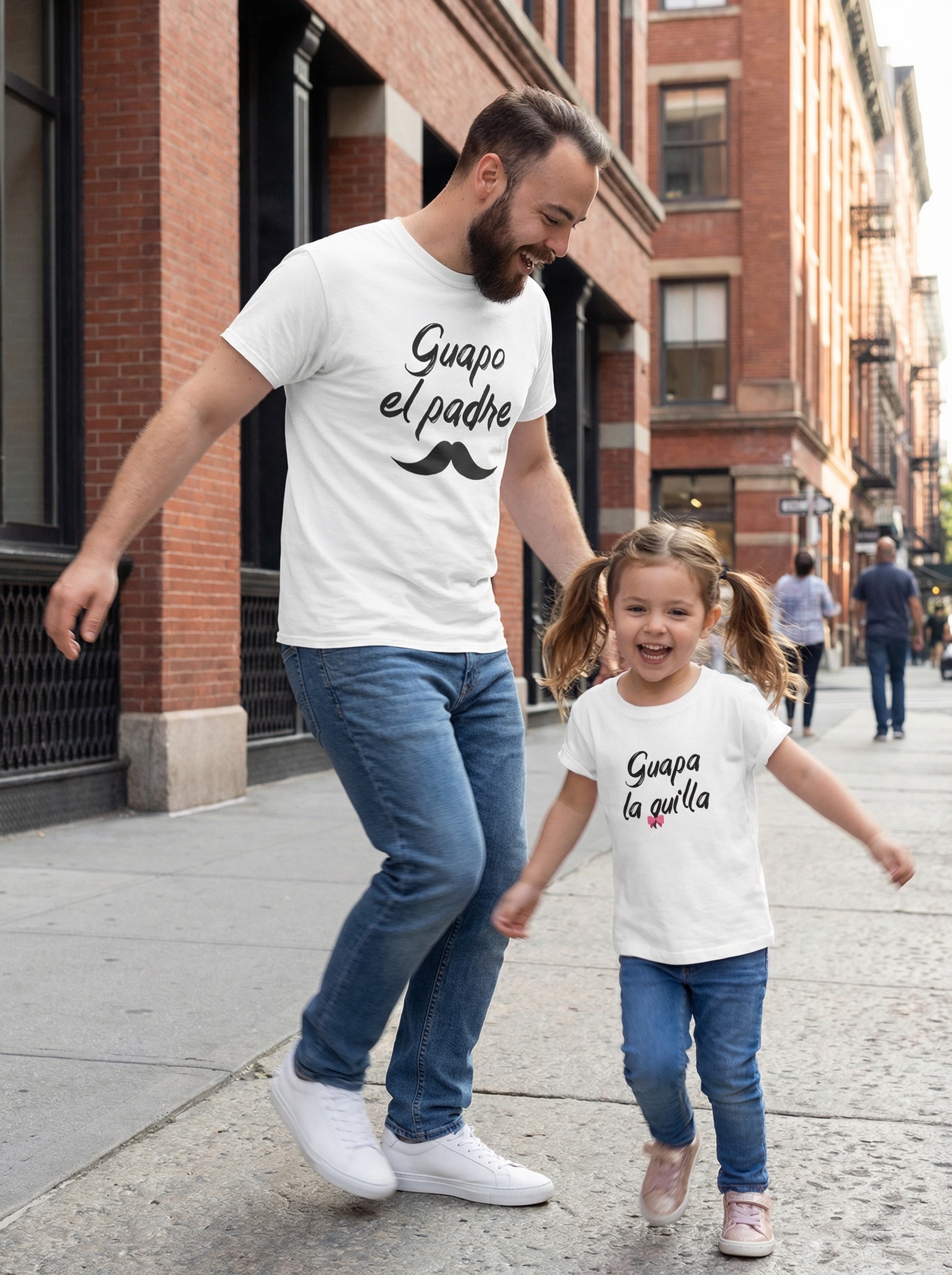 Pack camisetas a juego Día del Padre para toda la familia: ‘Guapo el padre’, ‘Guapo el quillo’, ‘Guapa la quilla’. Algodón blanco, diseños divertidos con bigote y pajarita. ¡Regalo familiar único!