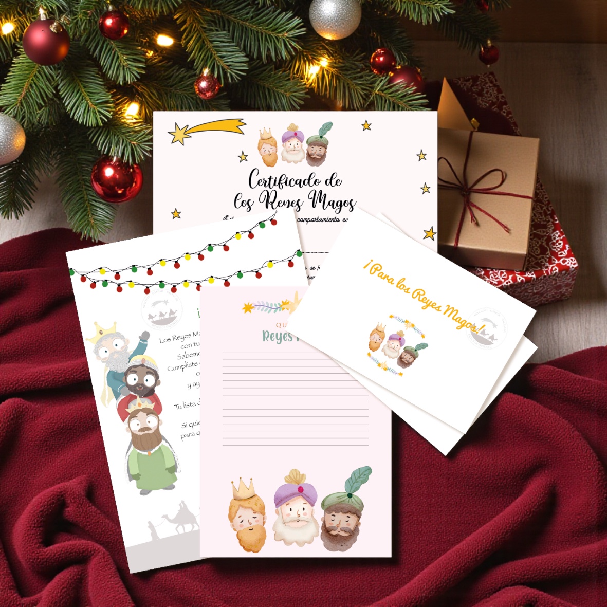 Pack carta Reyes Magos con certificado, sobre y hoja para escribir, diseñado para que los peques vivan la magia de la noche de Reyes mientras cuentan sus deseos a Melchor, Gaspar y Baltasar de una forma tierna, divertida y muy especial.